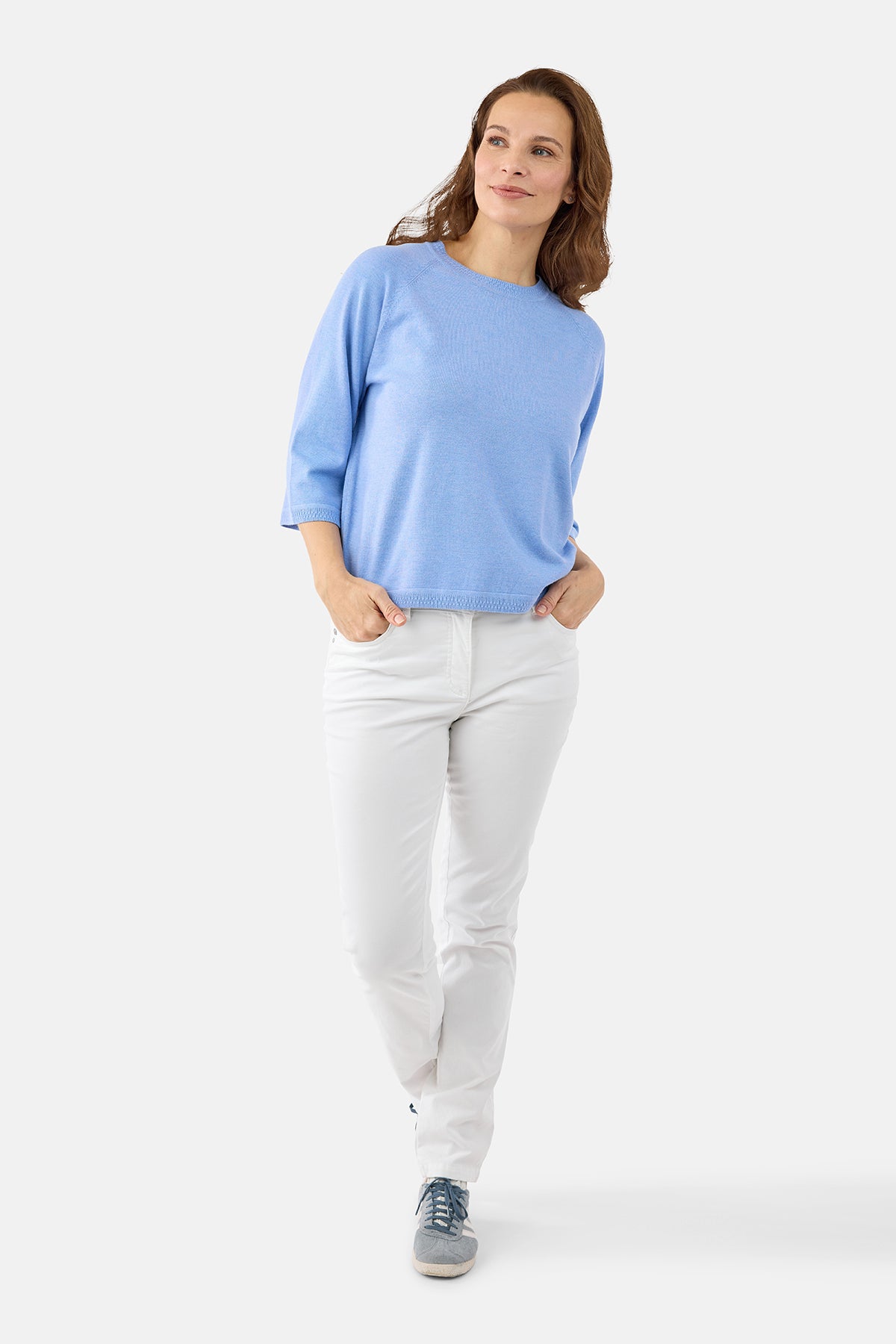 Strikken har en klassisk rund hals, som giver et enkelt og tidløst look, mens de 3/4-lange ærmer tilfører et let og anvendeligt udtryk – perfekt til overgangssæsoner. Den afslappede pasform falder flot uden at sidde stramt og giver god bevægelsesfrihed. Ribafslutninger ved ærmer og kant sikrer en pæn og velafsluttet finish.