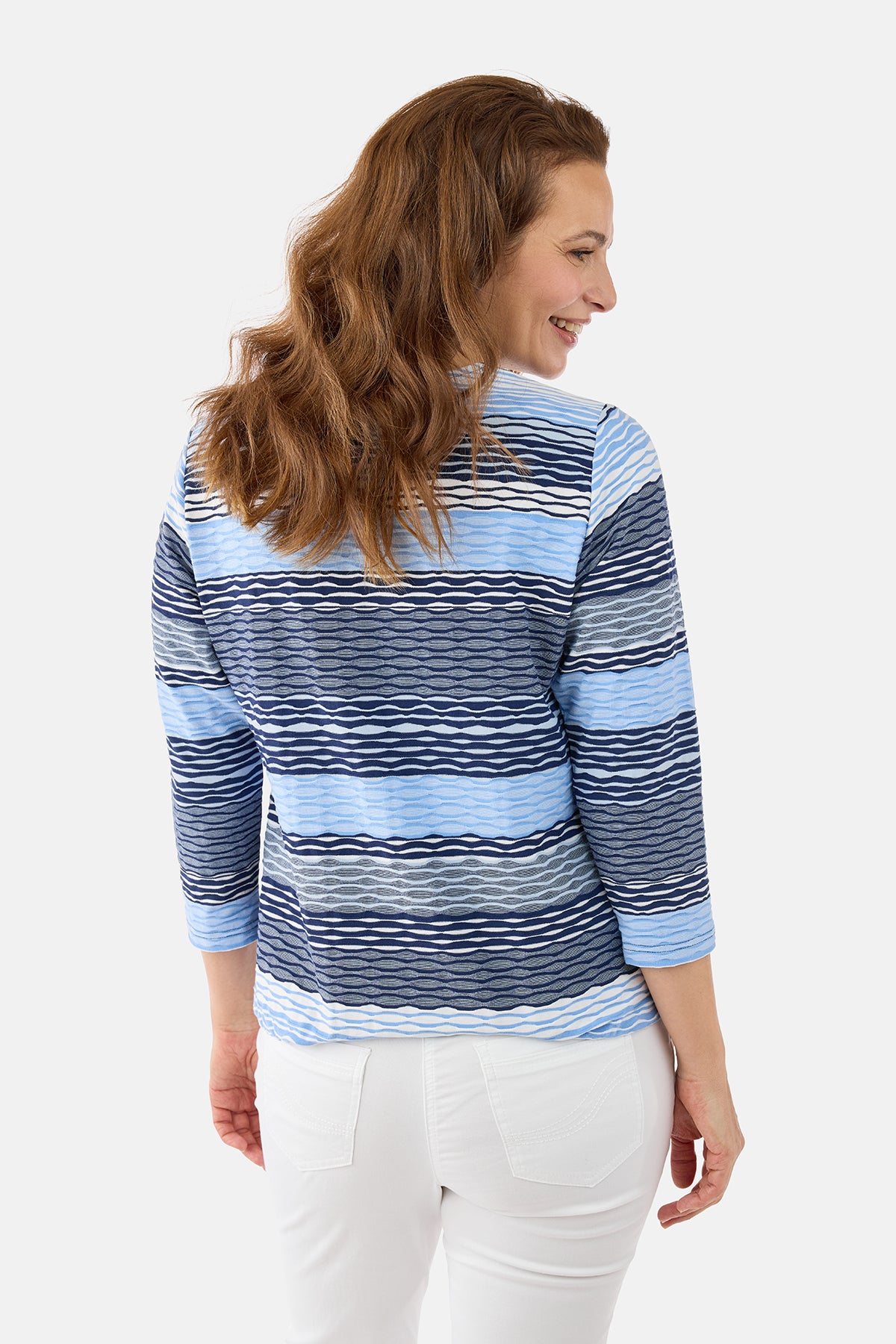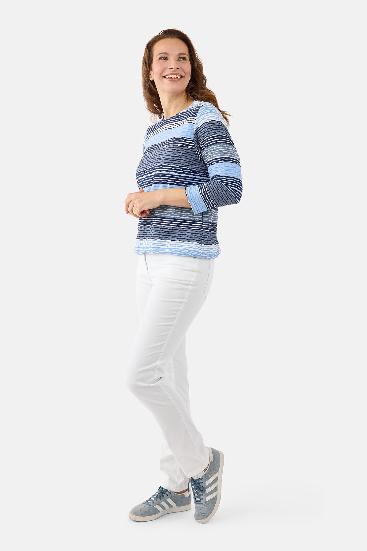 Designet har en klassisk rund halsudskæring og 3/4 lange ærmer, som gør den ideel til overgangsperioder eller som et let lag under en cardigan eller jakke. De vandrette striber i lyseblå, navy og grå toner skaber et stilfuldt spil i stoffet og gør T-shirten nem at kombinere med både neutrale og farverige underdele. Pasformen er afslappet og flatterende, så den falder pænt på kroppen uden at stramme.