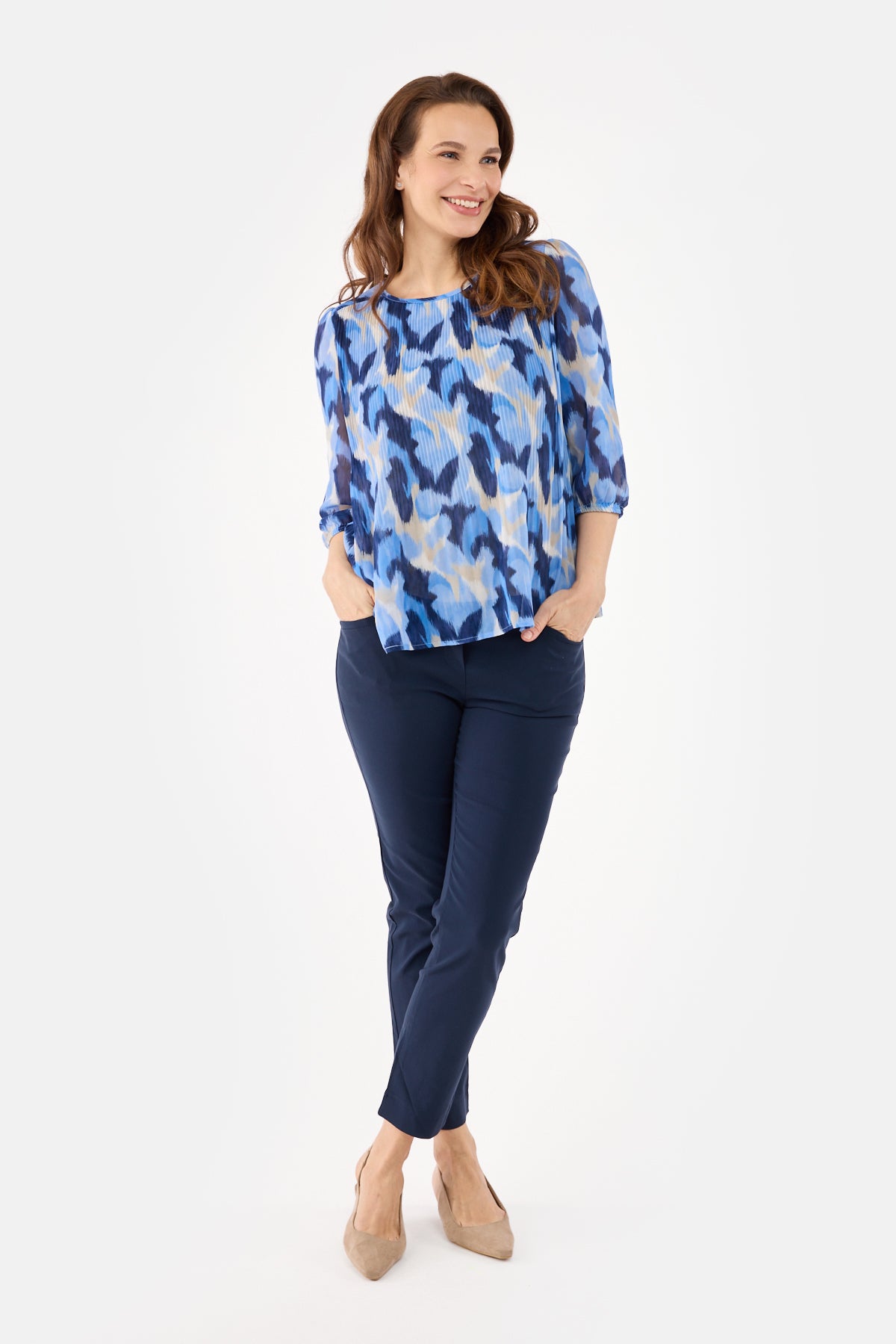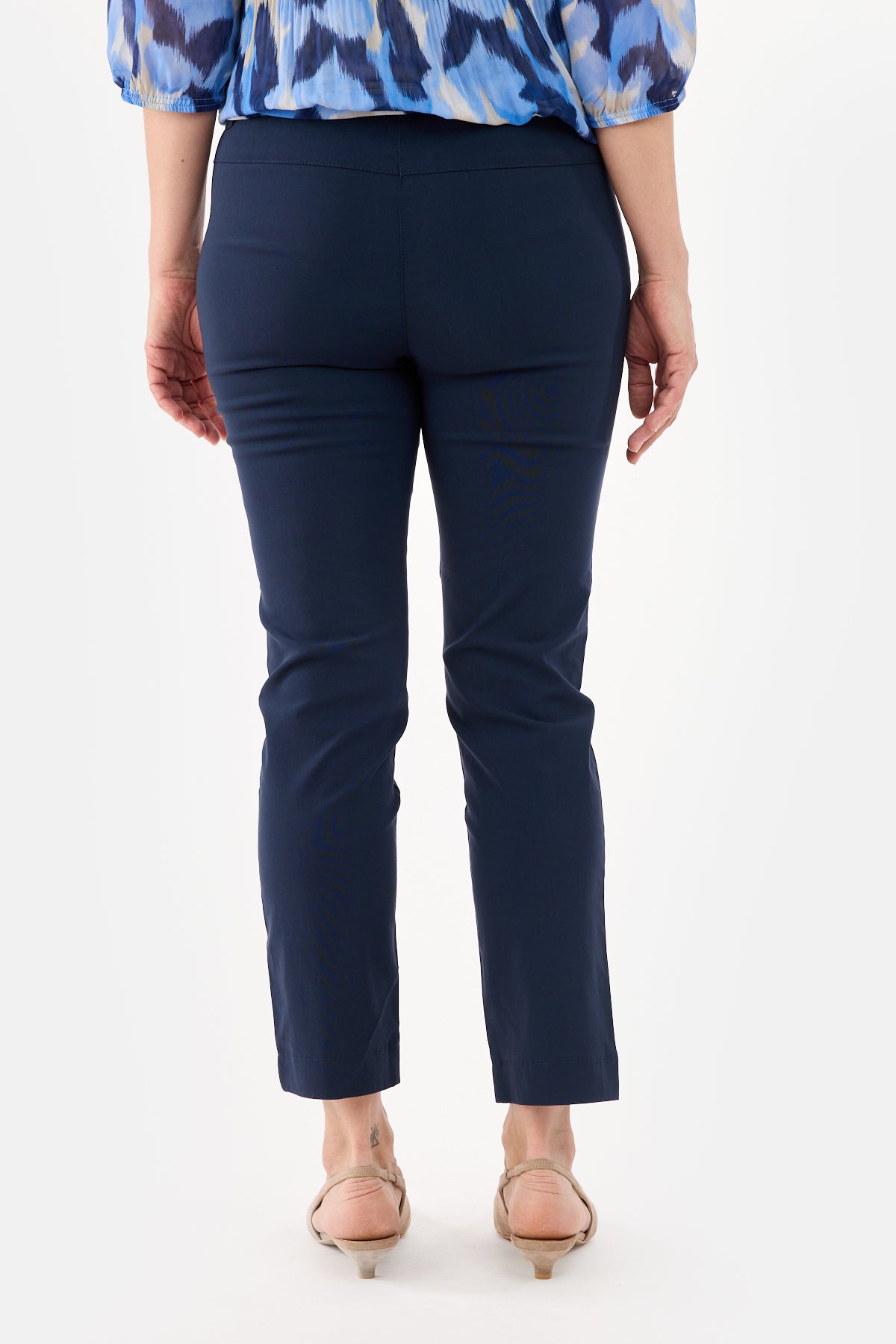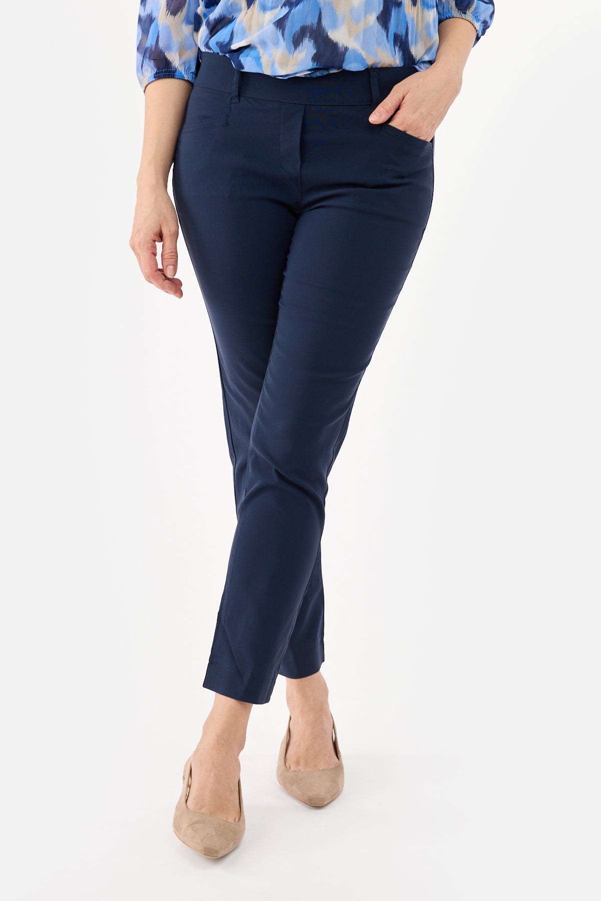 Bukserne er designet med fast linning, bæltestropper og skrålommer foran, som tilfører et klassisk touch. Den lette stretch i kvaliteten sikrer god bevægelsesfrihed og en behagelig pasform hele dagen. Den ankelnære 7/8-længde gør dem perfekte til både flade sko og hæle.