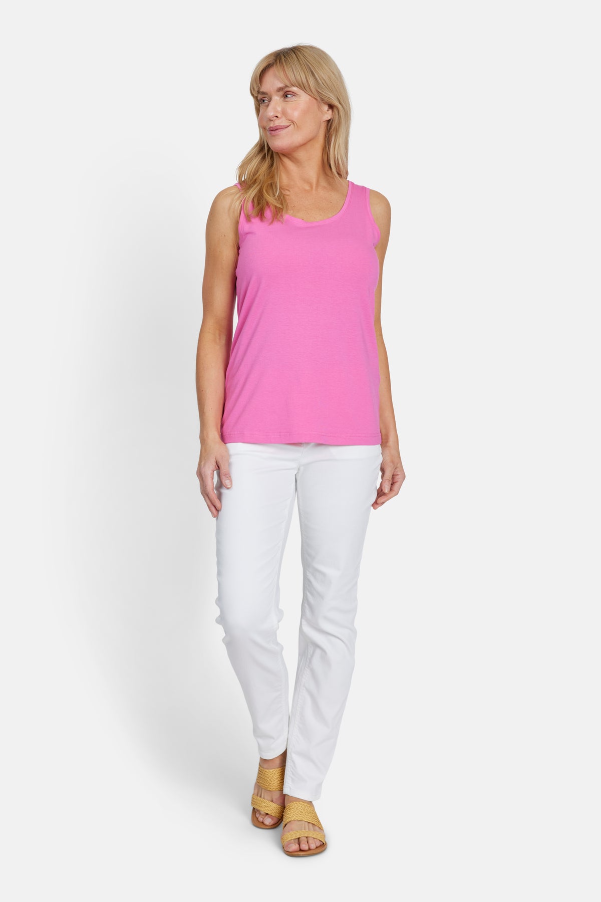 Toppen er designet med rund halsudskæring og brede skulderstropper, der sikrer en behagelig pasform og et klassisk, stilrent look. Den bløde og let strækbare kvalitet føles behagelig mod huden og giver høj komfort hele dagen.