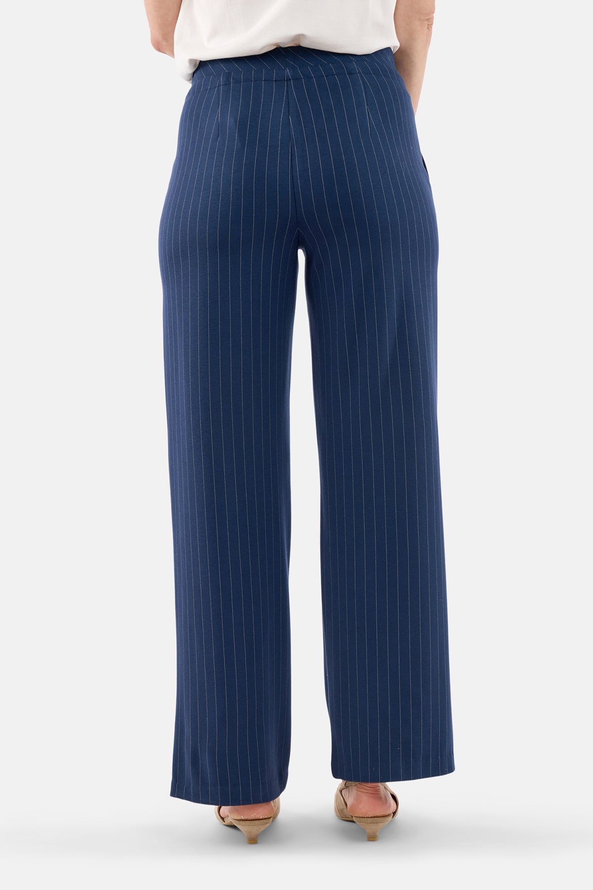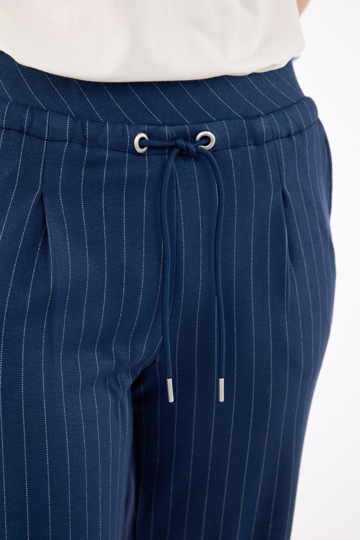 Stilrene og komfortable bukser i en klassisk navy farve med fine, lodrette nålestriber, der giver et elegant og let forlængende udtryk. Det tidløse design gør bukserne velegnede til både hverdag, arbejde og mere pæne anledninger.