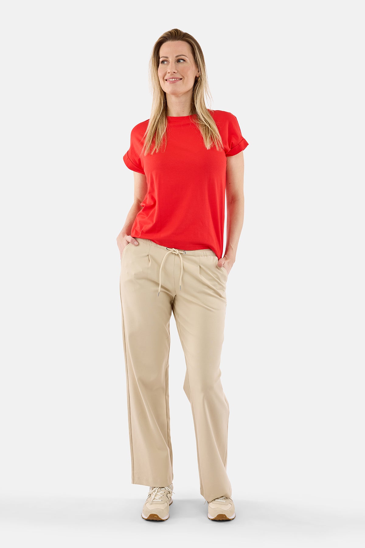 Bukserne er designet med elastisk talje og justerbar snøre, som sikrer en behagelig pasform og høj komfort hele dagen. De praktiske sidelommer tilfører et funktionelt element, mens det lige ben giver et klassisk og flatterende straight fit, der falder pænt langs benene.