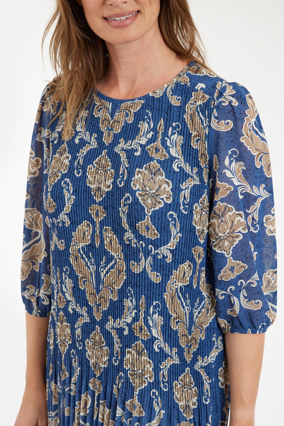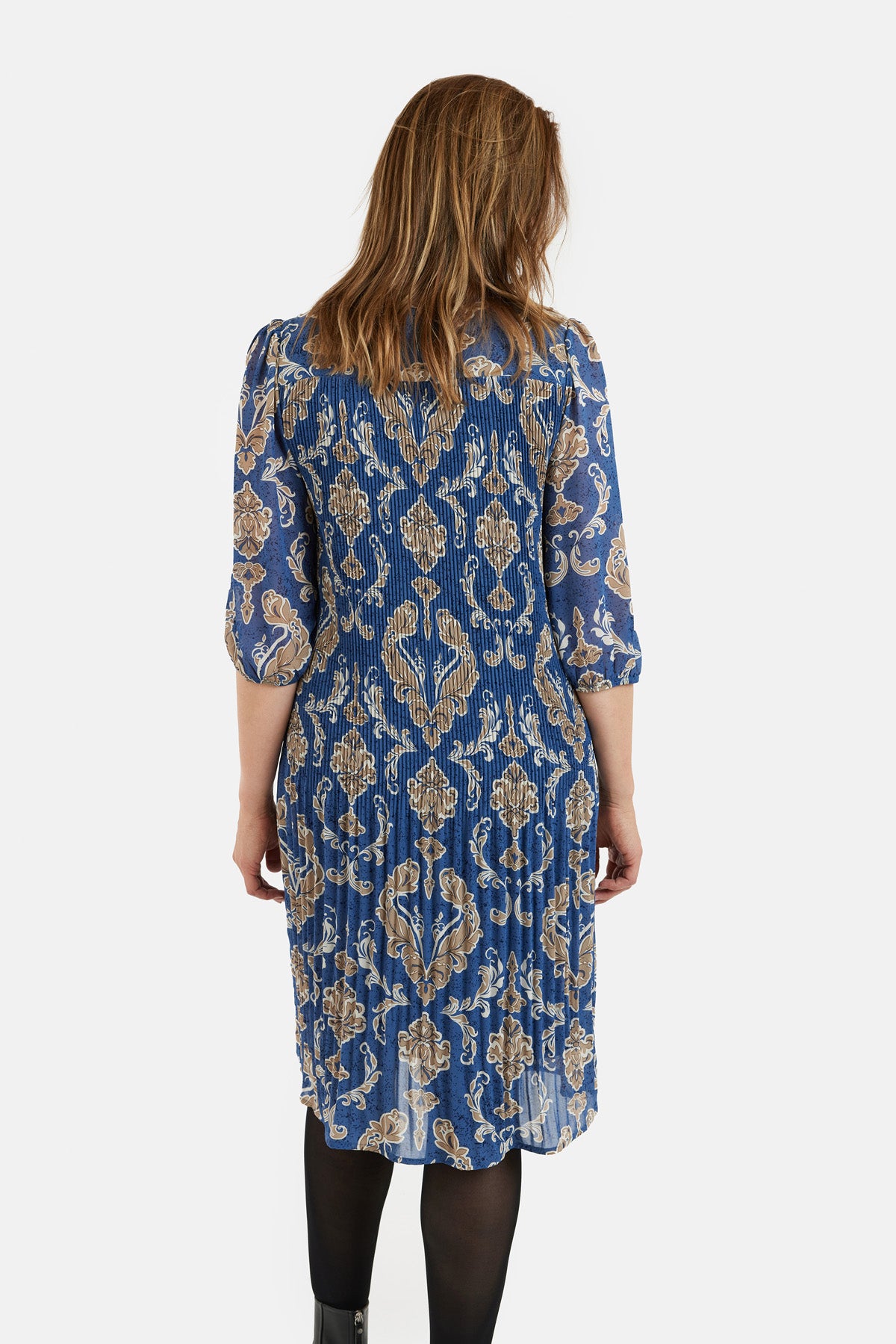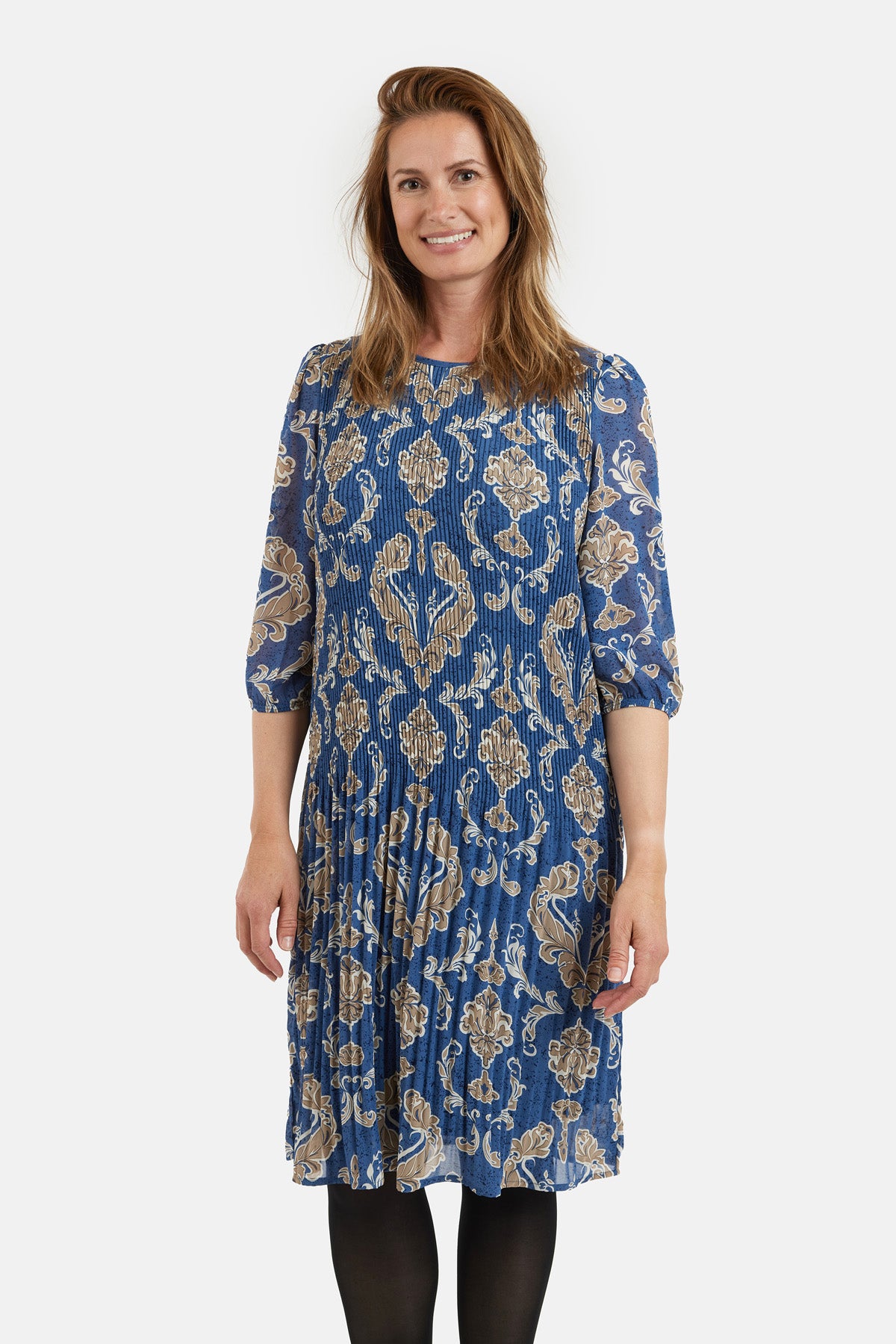 Kjole fra Brandtex i blå med smukt brunmeleret mønster og feminine plisseringer. Designet med rund halsudskæring og 3/4-ærmer med let puf og elastikkant. Løs og komfortabel pasform med let transparens i ærmerne. Stoffet falder flot og giver en elegant bevægelse. En stilfuld kjole, der egner sig til både hverdag og pænere anledninger.