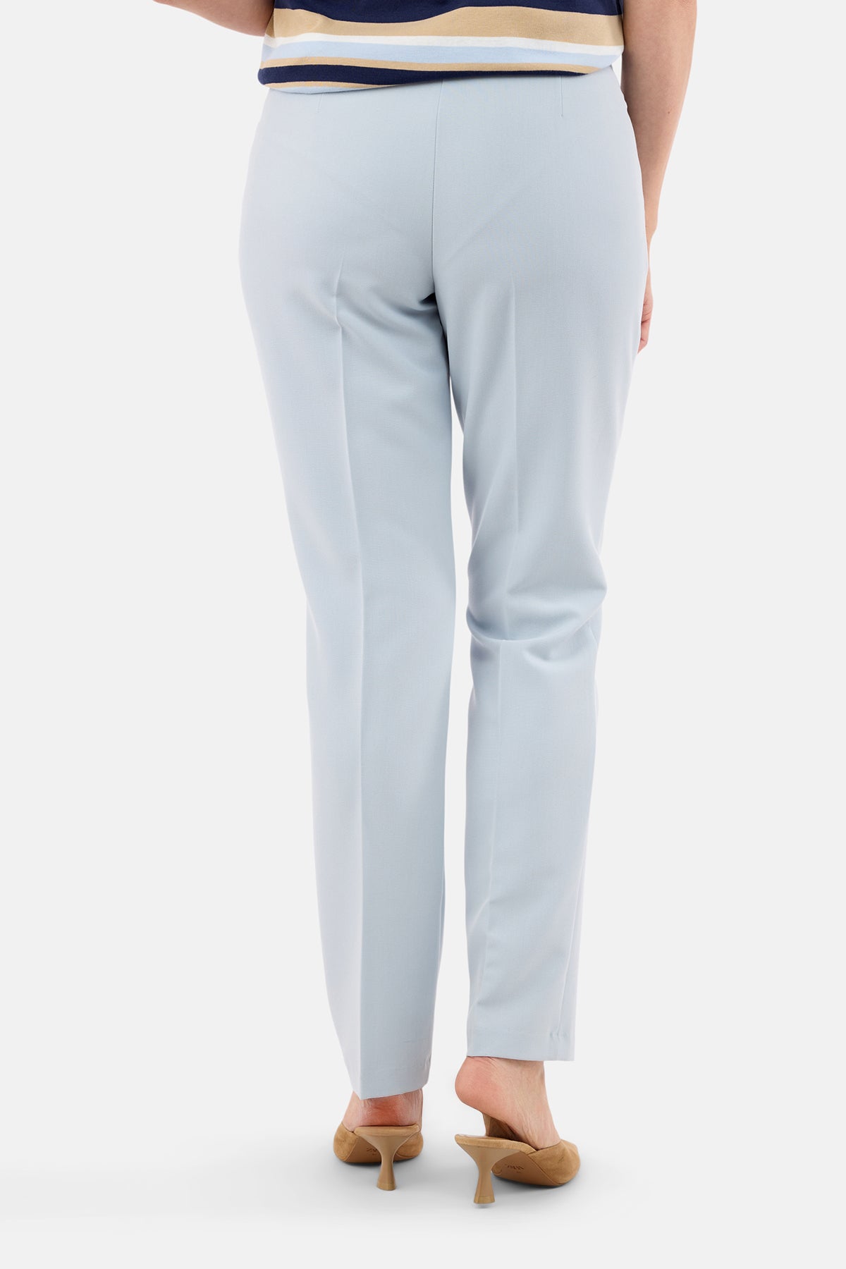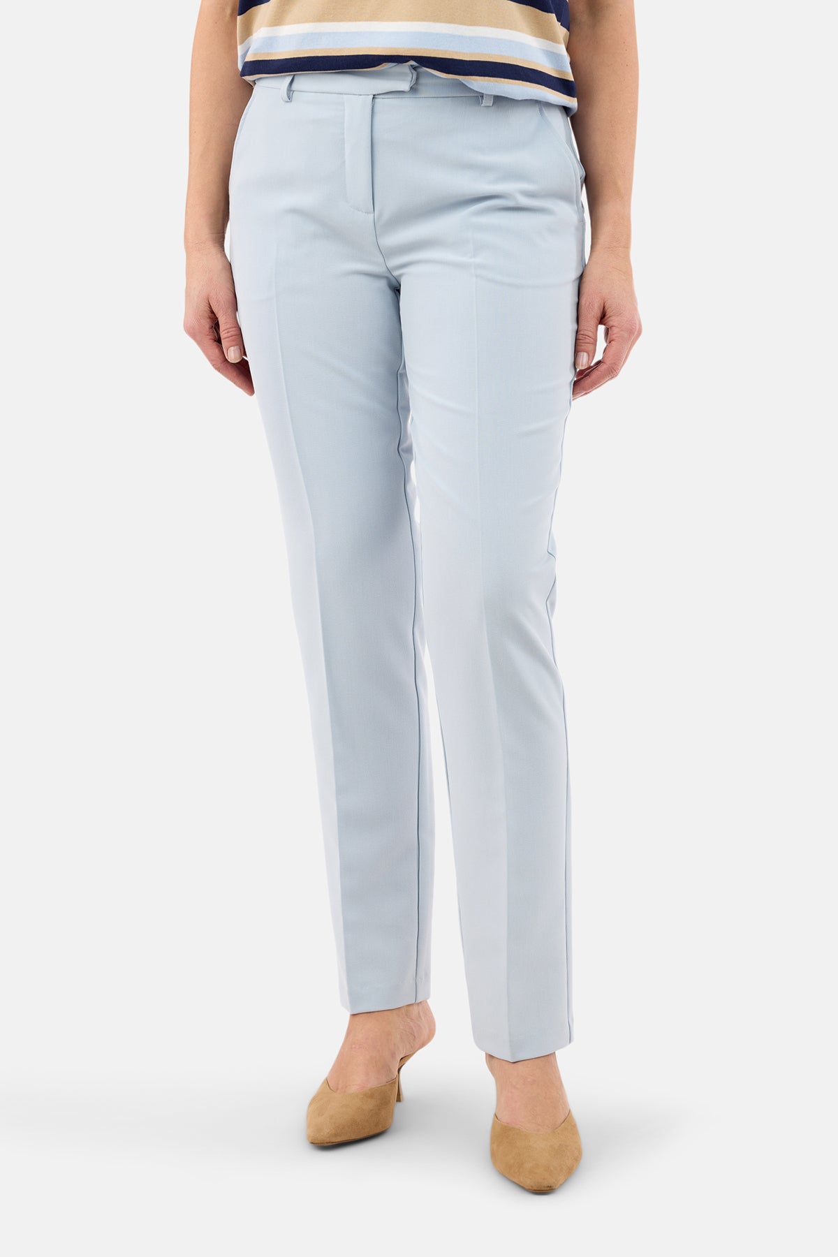 Habit bukser i en elegant lyseblå nuance, der kombinerer klassisk tailoring med moderne komfort. Den glatte, vævede kvalitet har et flot fald og giver et eksklusivt udtryk, samtidig med at materialet sikrer god bevægelsesfrihed og en behagelig pasform hele dagen.
