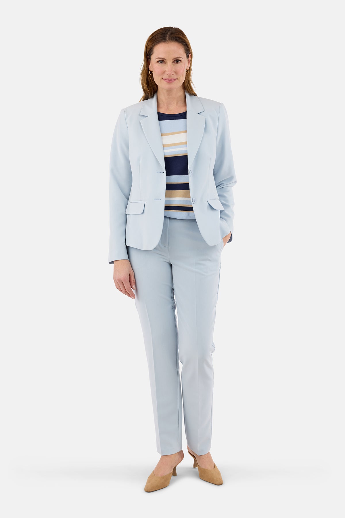 Den lyseblå farve fungerer perfekt som del af et matchende jakkesæt, men kan også styles med en skjorte, strik eller en enkel top for et mere afslappet, men stadig professionelt udtryk.