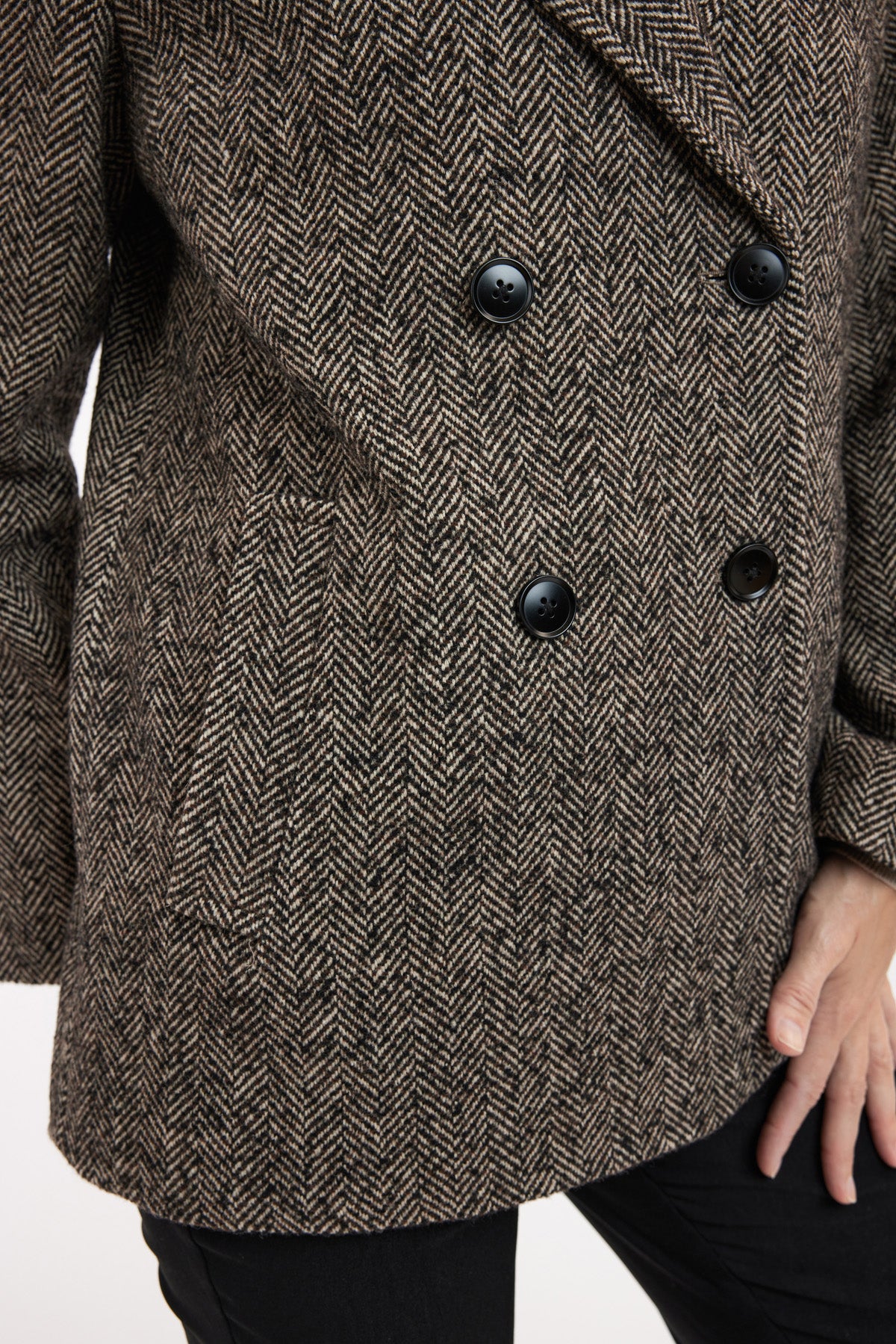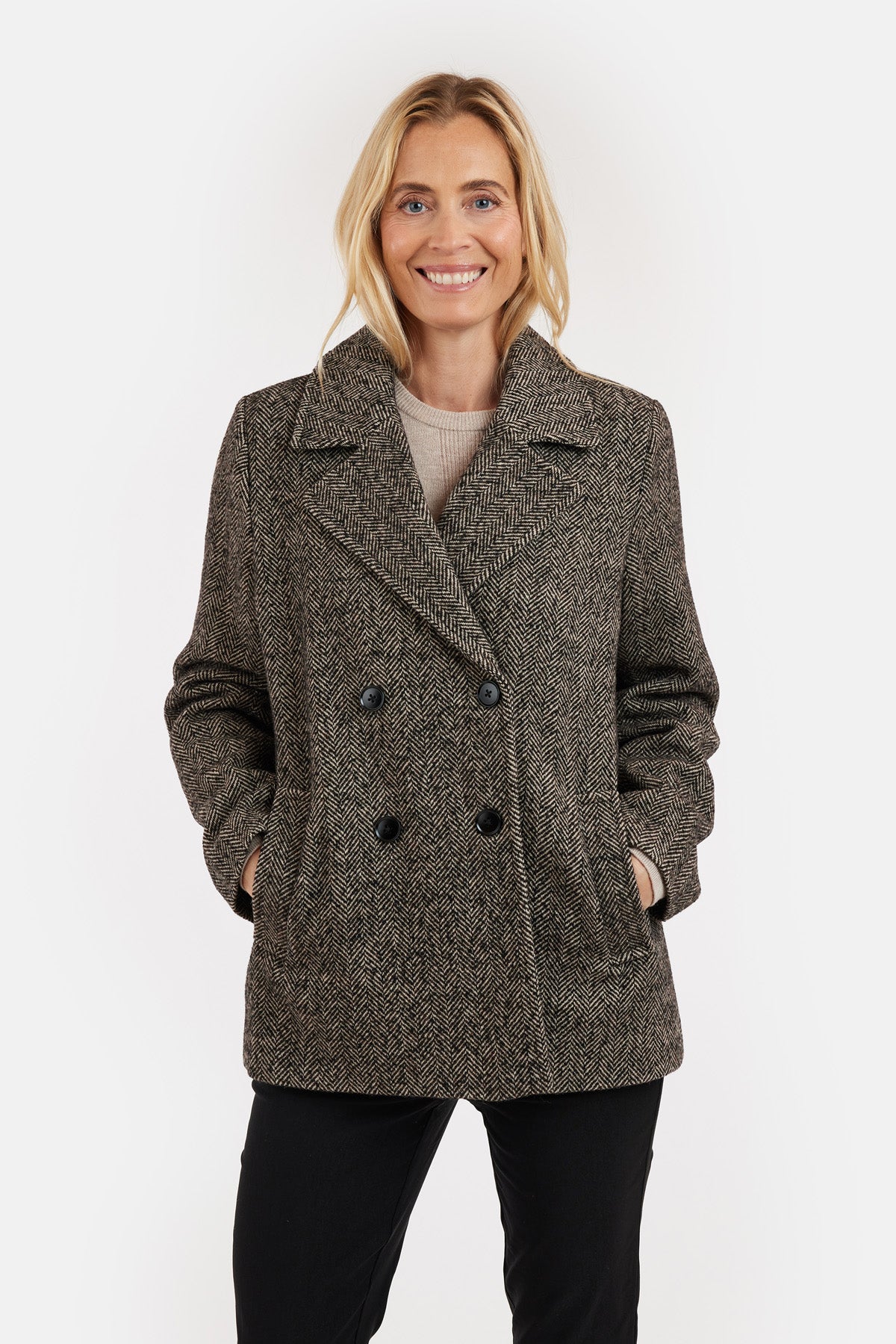 Flot jakke i uld, polyester, akryl, viskose og polyamid fra Brandtex. Denne jakke er med krave og revers og dobbeltradet knaplukning foran. Den har stiklommer i siden. En rigtig lækker og smart jakke til efteråret.