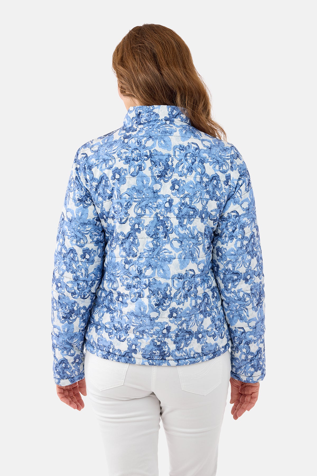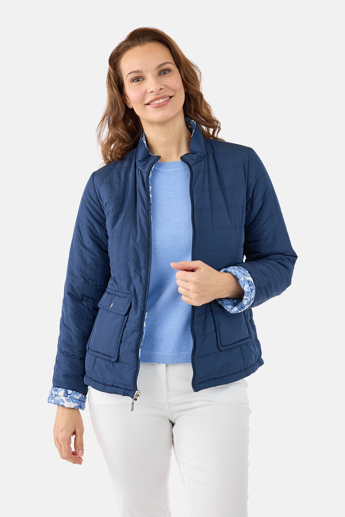 Smart og praktisk vendbar jakke, der giver dig to looks i én. Jakken har på den ene side et flot blå/hvidt blomsterprint med et let “akvarel-udtryk”, og på den anden side en ensfarvet mørk navy, som gør den ekstra alsidig og nem at style til både hverdag og fritid.