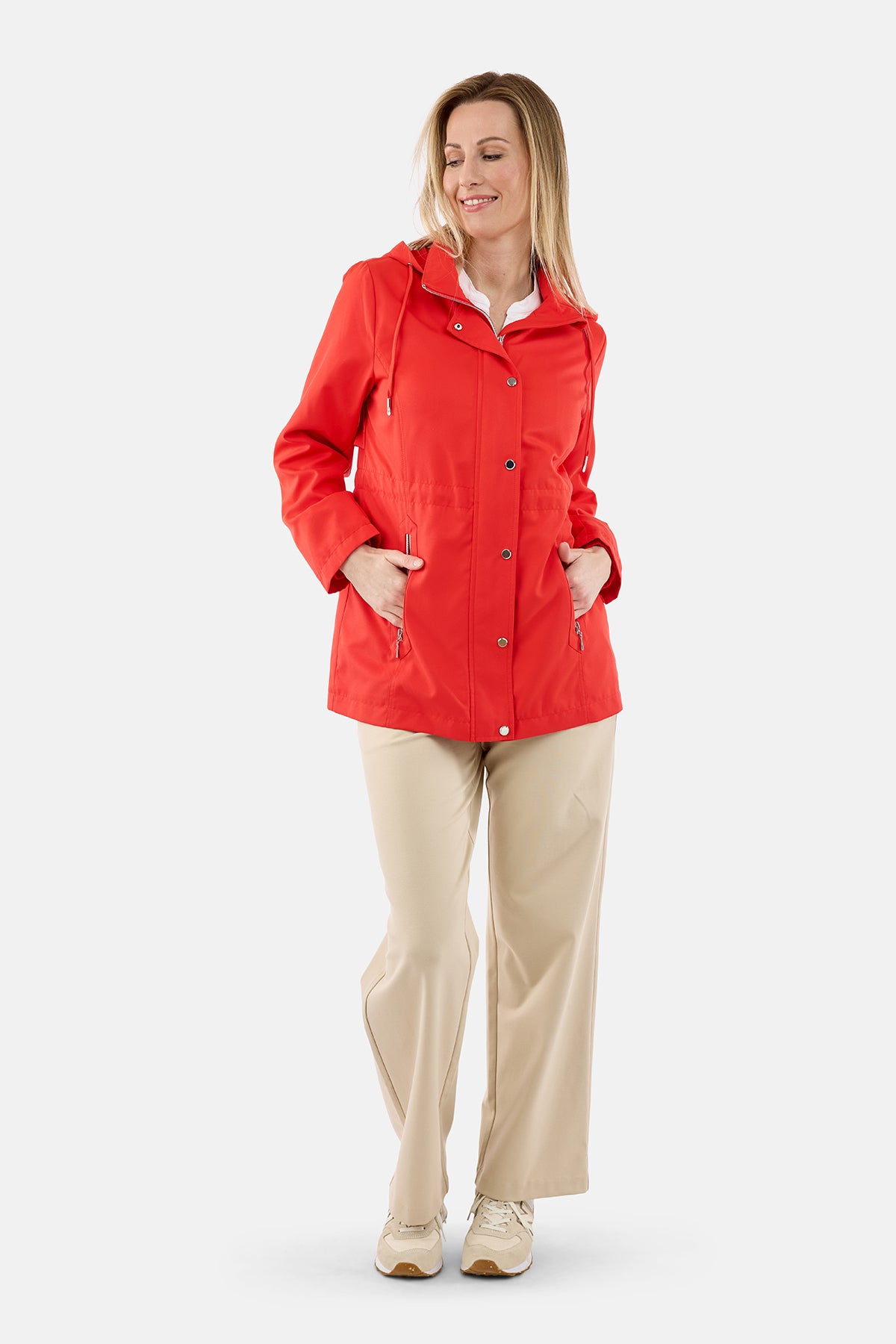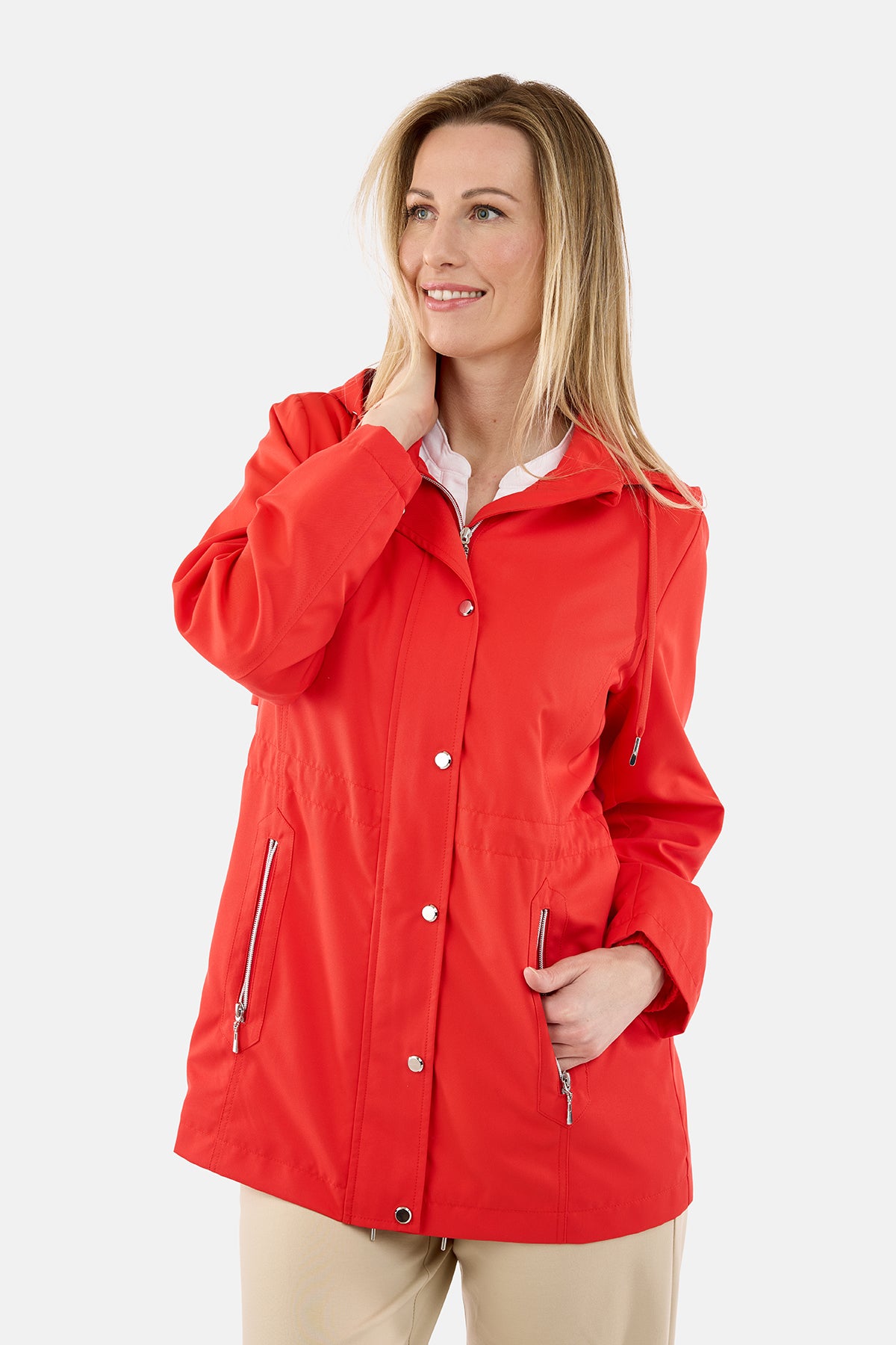 Smart og praktisk jakke i en flot rød farve, der giver et friskt og iøjnefaldende look til både hverdag og fritid. Jakken er fremstillet i en glat og let kvalitet, som gør den ideel som overgangsjakke, når vejret skifter, og du har brug for et ekstra lag uden at føle dig tungt klædt på.