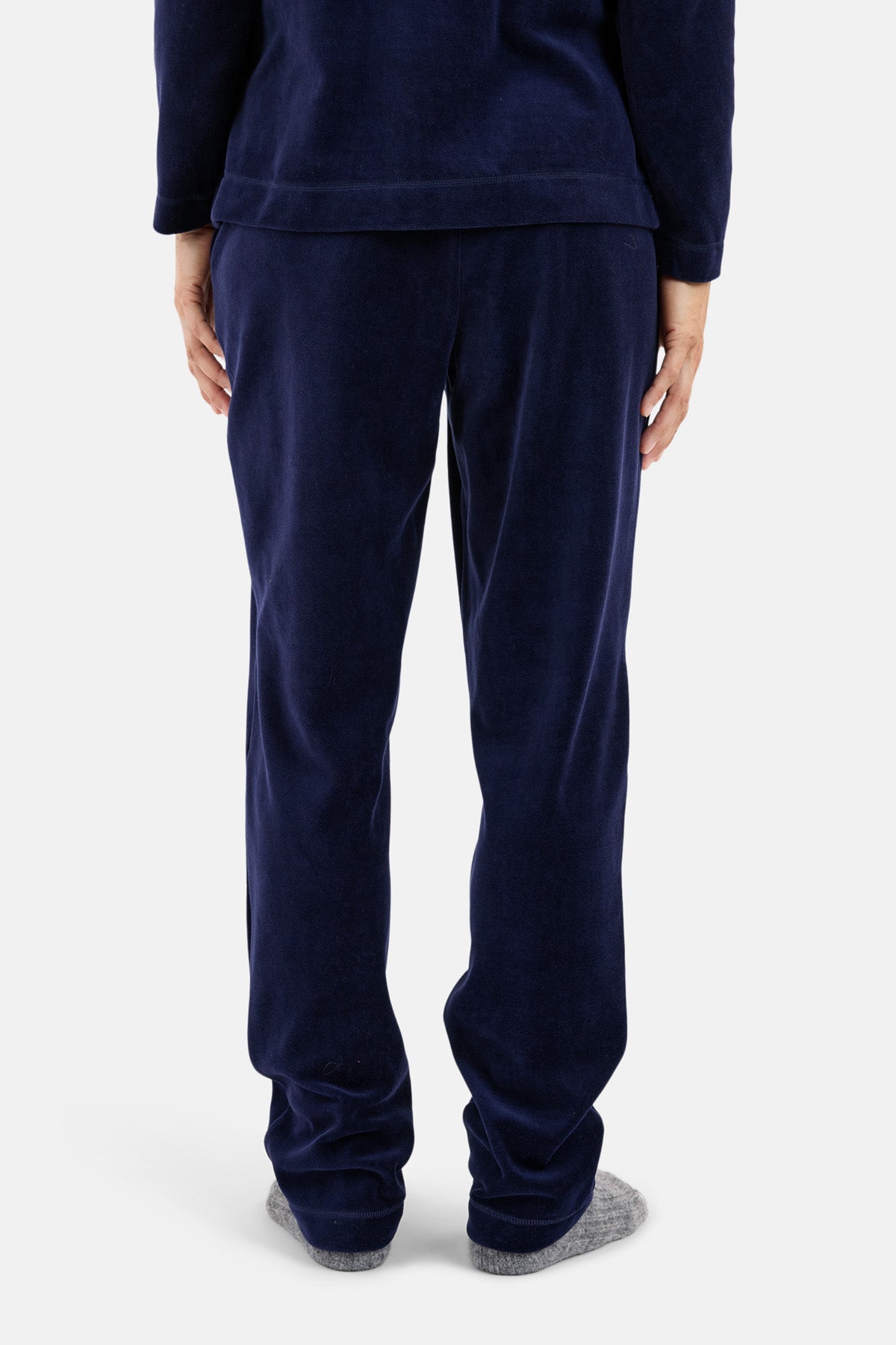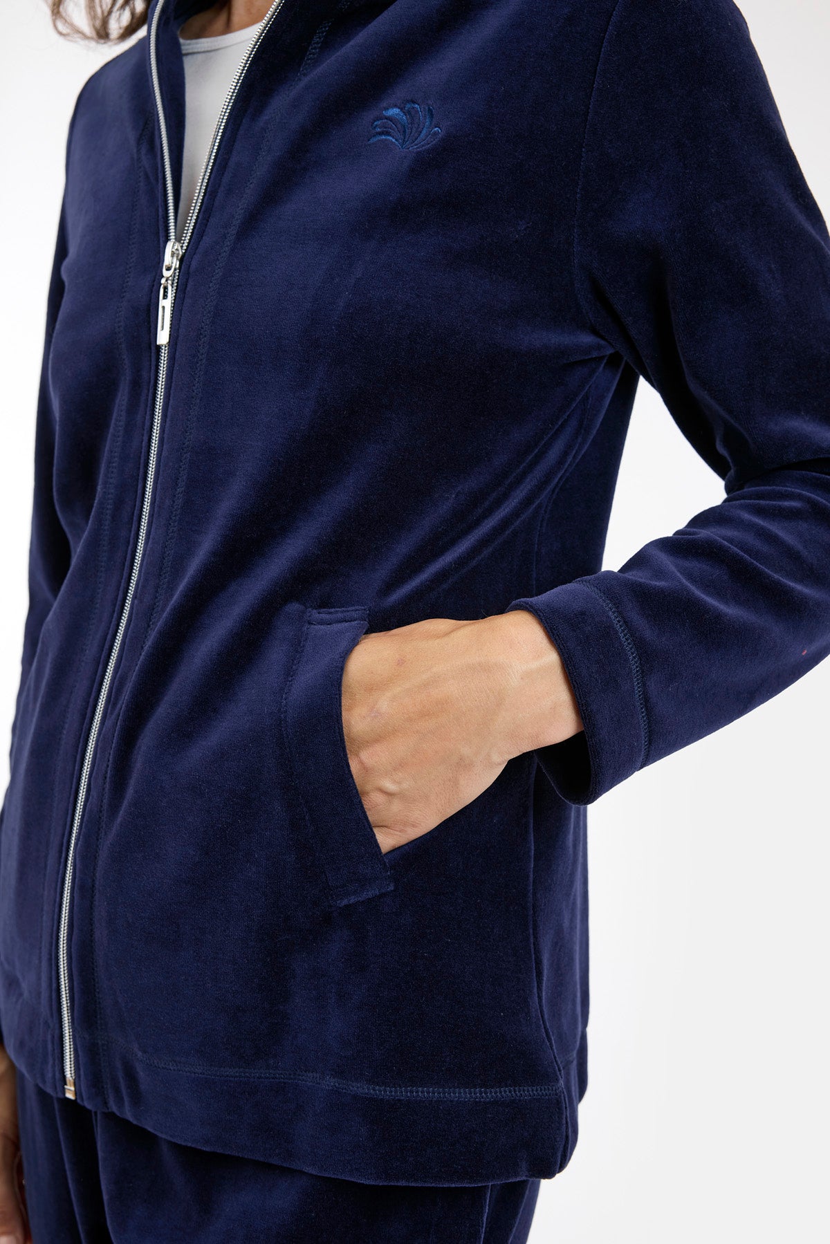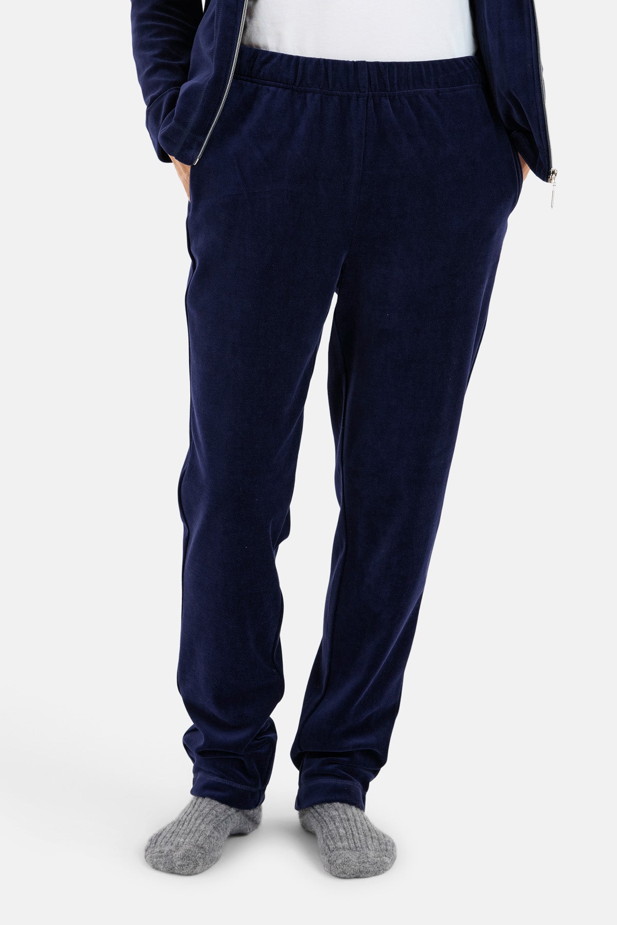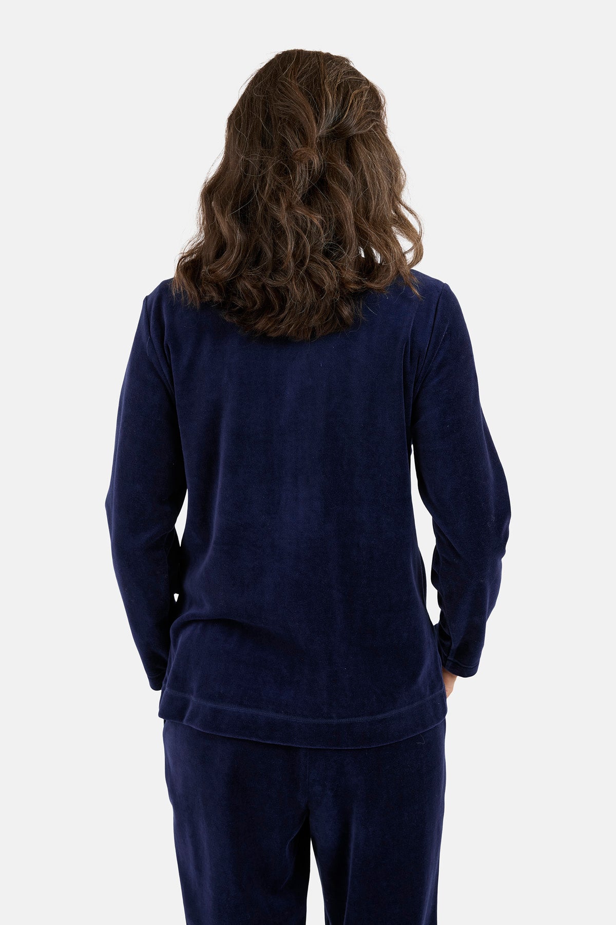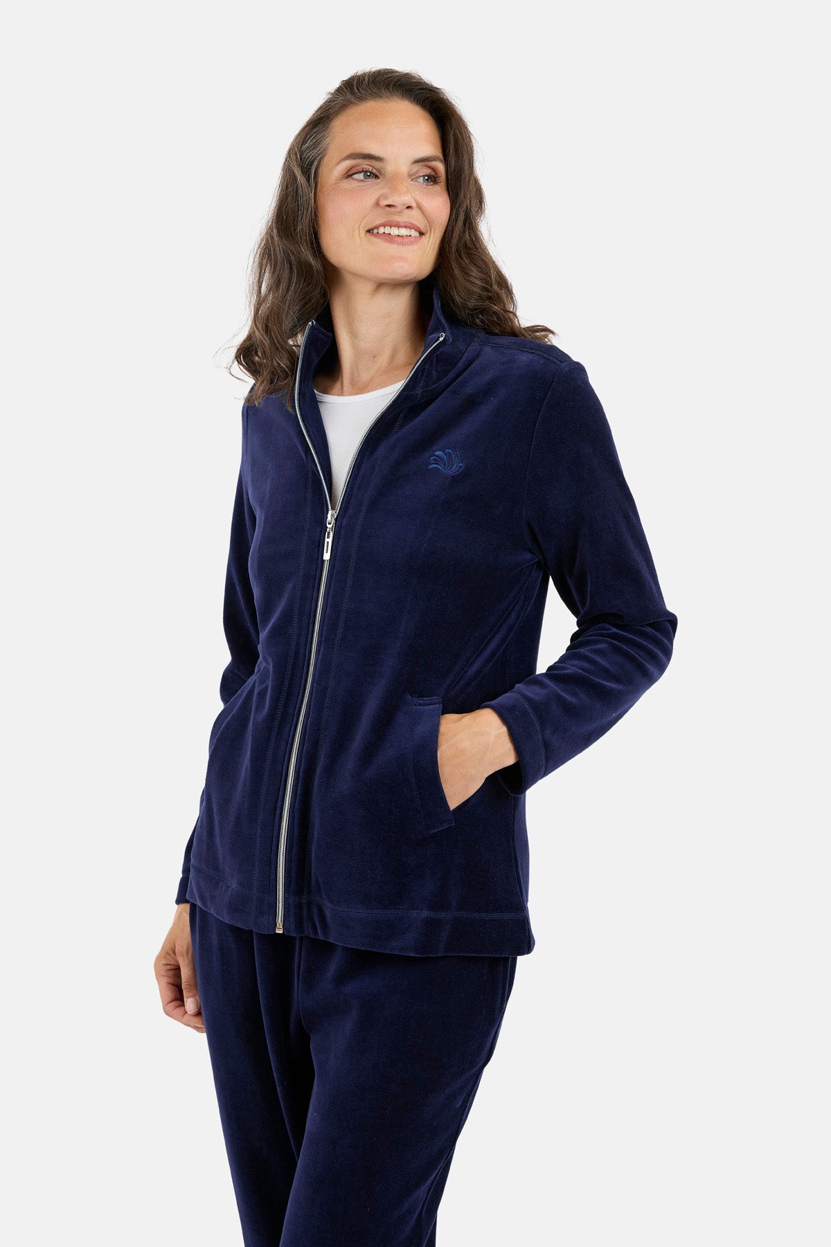 Fantastisk velour hyggesæt i bomuld og polyester fra Brandtex, Sættet består af en langærmet overdel og lange bukser. Overdelen er med gennemgående lynlås foran og høj krave. Der er stiklommer foran og et lille detalje broderi på brystet. Bukserne er med elastik i taljen og lige ben med god vidde. Et sæt der er nemt at hoppe i, og svær at tage af igen, da det er et fantastisk sæt. Modellen er 175 cm høj og har str. M på.
