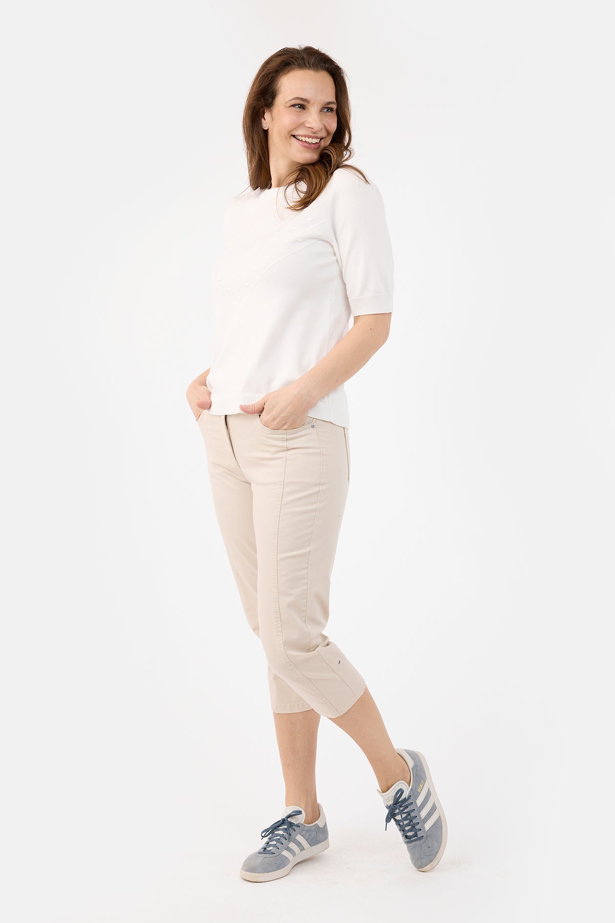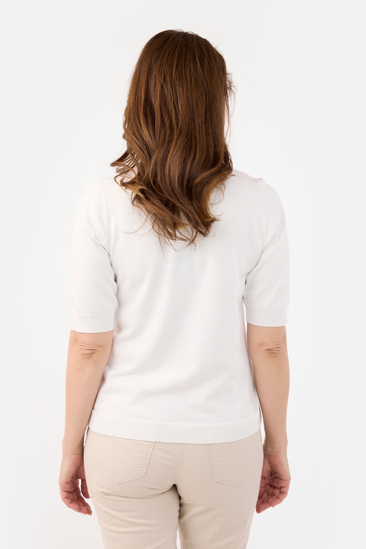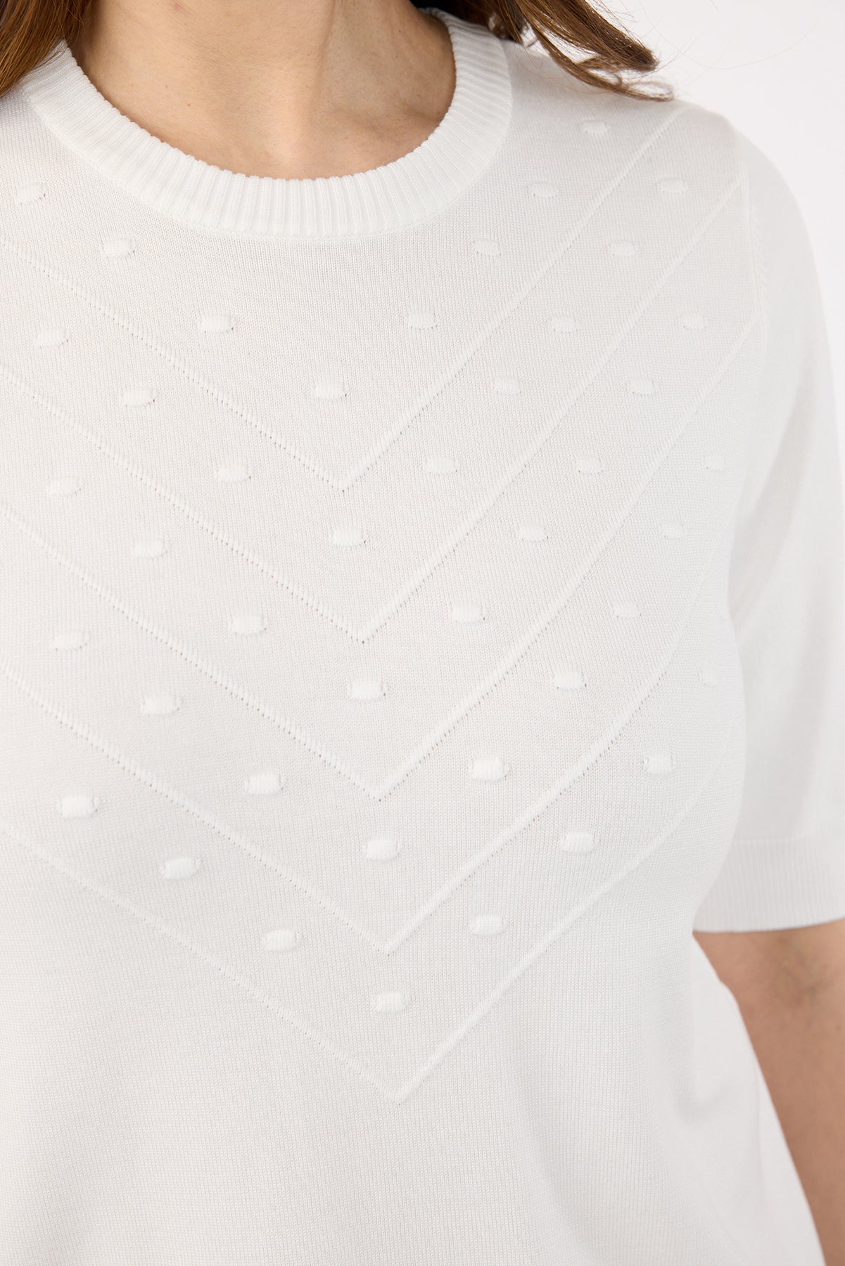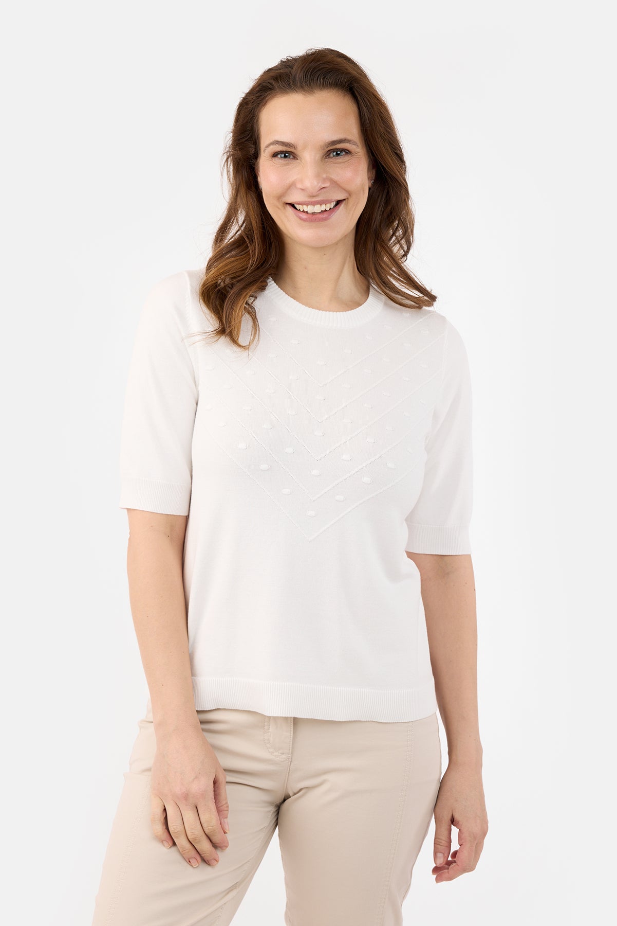 Strikken har korte ærmer og en rund halsudskæring med ribkant, som giver et klassisk og velafbalanceret udtryk. Det diskrete strukturmønster foran tilfører dybde og et eksklusivt præg, mens ribkanter ved ærmer og bund sikrer en flot pasform. Snittet er enkelt og behageligt, hvilket gør strikken nem at bruge hele dagen.