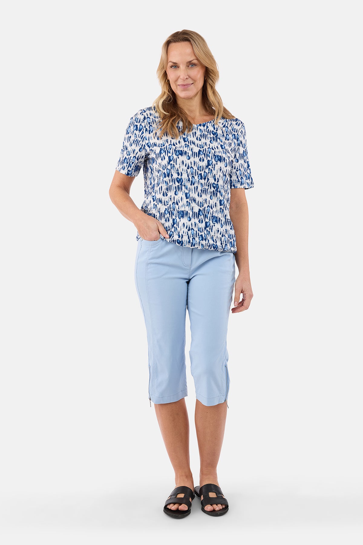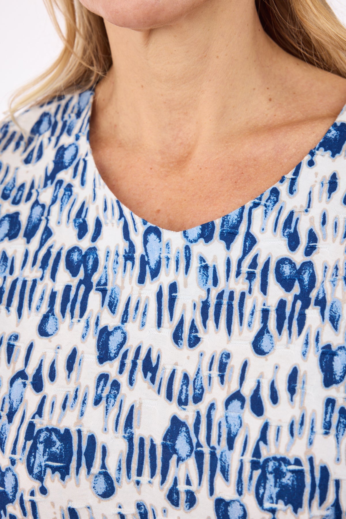 Kortærmet T-shirt i et moderne blå/hvidt print med et let grafisk og organisk udtryk. Det abstrakte mønster giver blusen karakter og gør den nem at style med både ensfarvede bukser og denim.