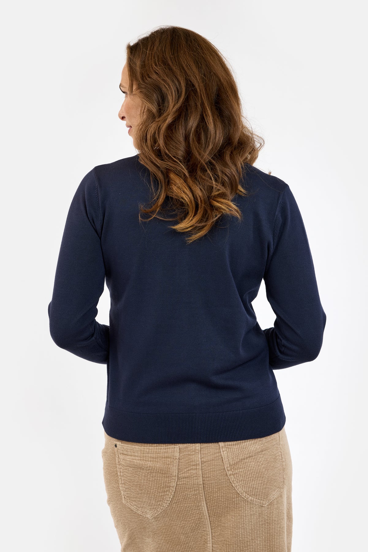 Klassisk og feminin langærmet cardigan fra Brandtex, designet i en smuk navy farve. Den ensfarvede stil gør cardiganen nem at kombinere med både mønstrede toppe og mere neutrale underdele – perfekt til både hverdag og arbejde.