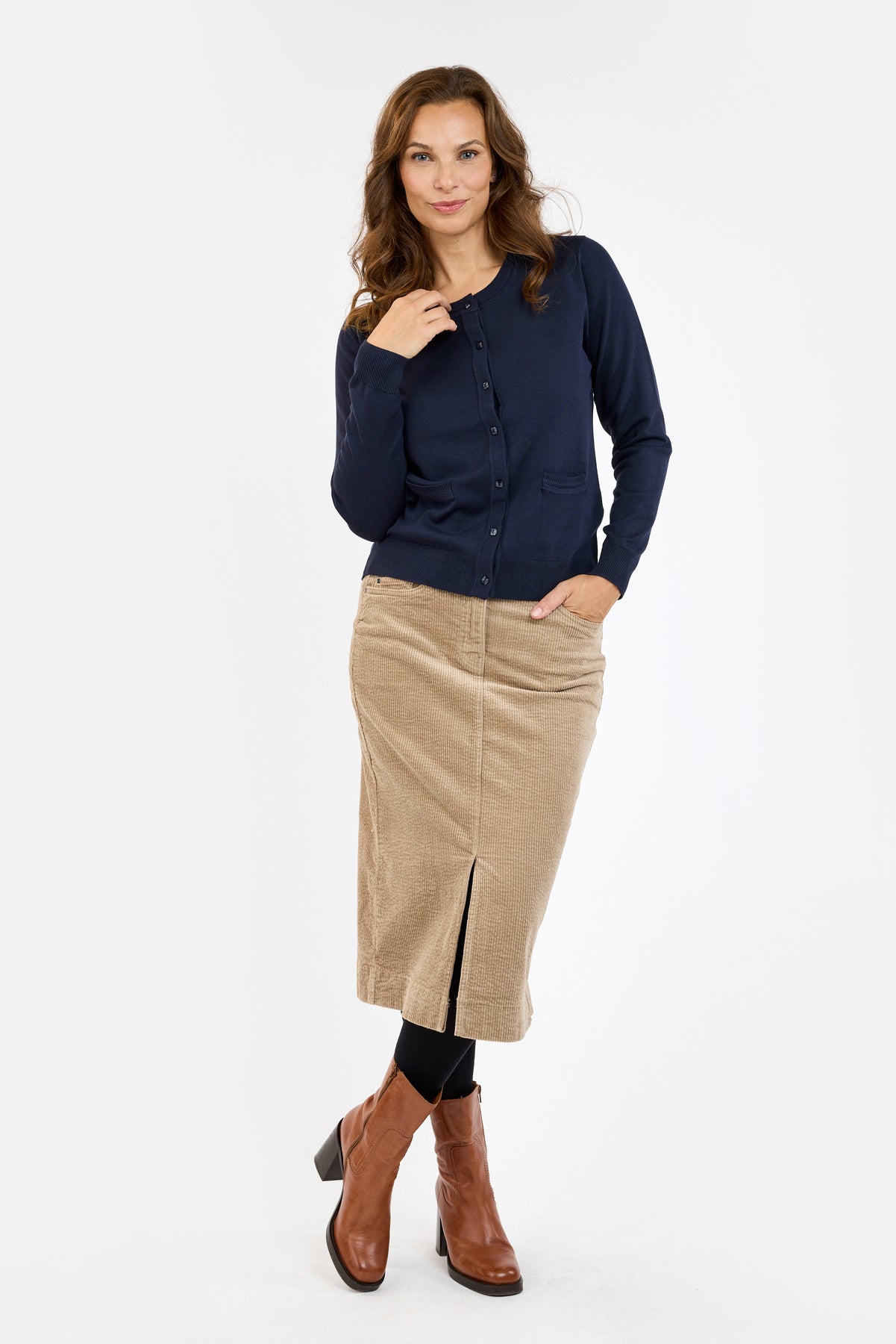 Cardiganen har en rund halsudskæring og gennemgående knaplukning med matchende knapper, som giver et elegant og tidløst udtryk. De praktiske frontlommer tilfører et afslappet touch, mens ribkanter ved ærmer, bund og hals sikrer en pæn og velafsluttet pasform.