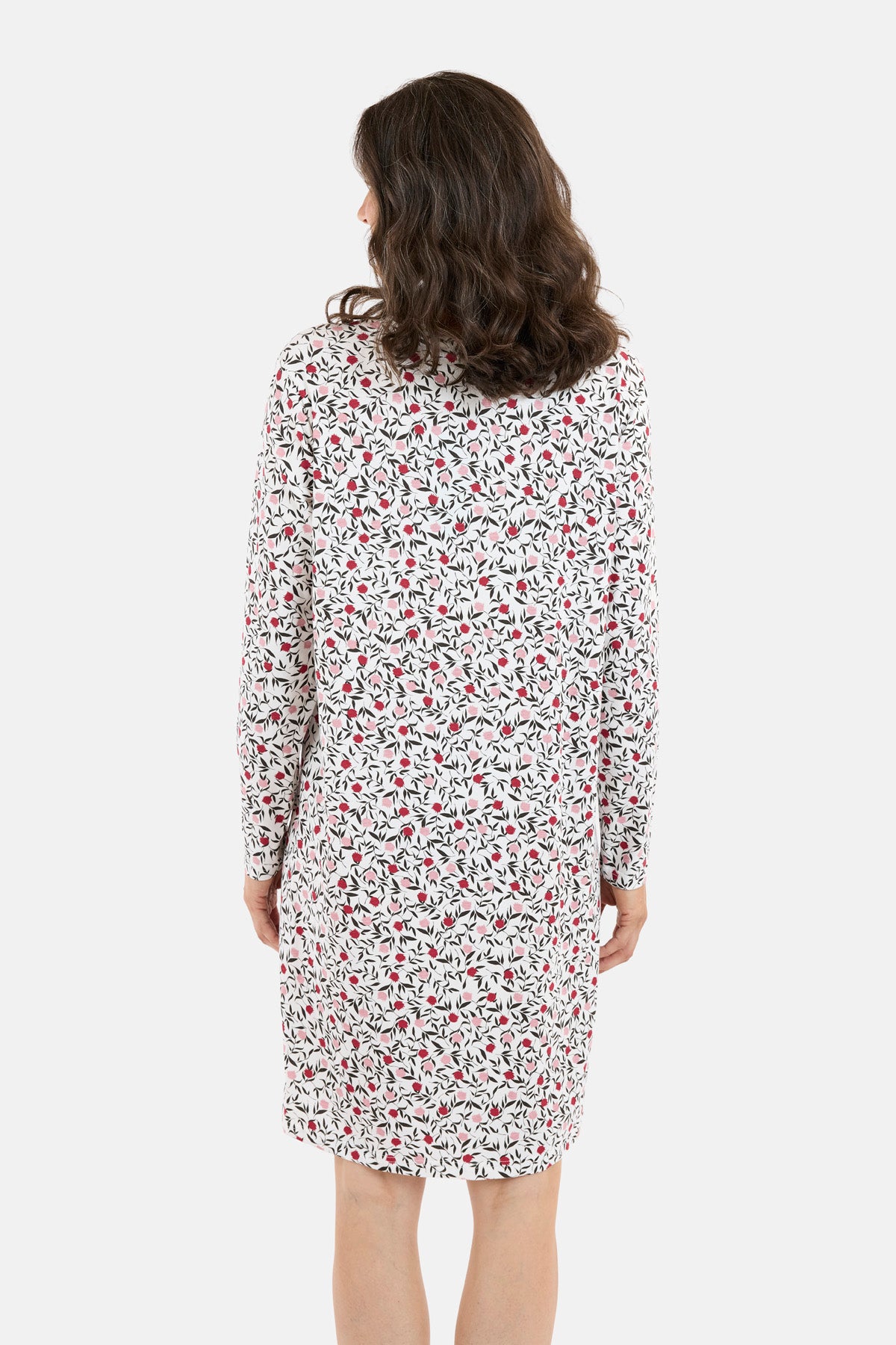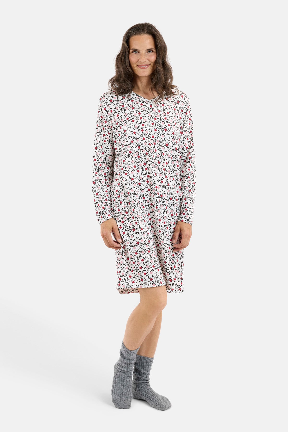 Behagelig natkjole i et fint mønster med små røde og sorte blade på hvid bund. Den er designet med rund hals og lange ærmer, som gør den ideel til kølige nætter.