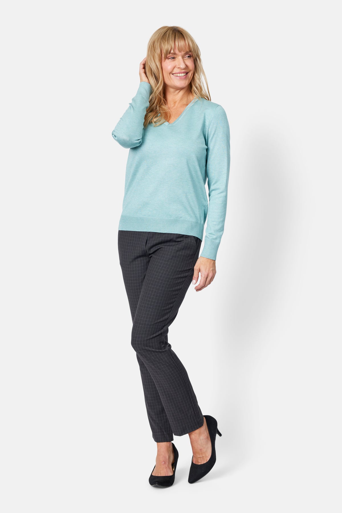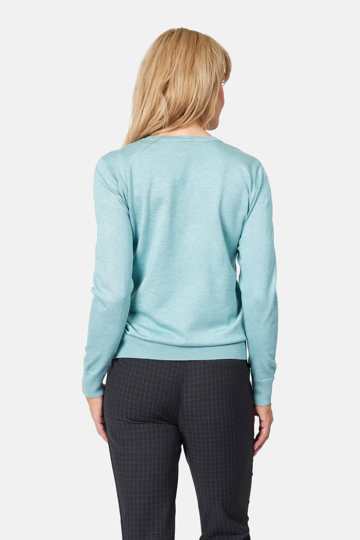 Strik pullover i viskose og polyester fra Brandtex. Denne fine strik har V udskæring i halsen og lange, smalle ærmer som afsluttes med en bred ribkant, som går igen forneden. Brug denne klassiske pullover som den er, til et par bukser for et afslappet look. Eller style den udenpå en smart skjorte.