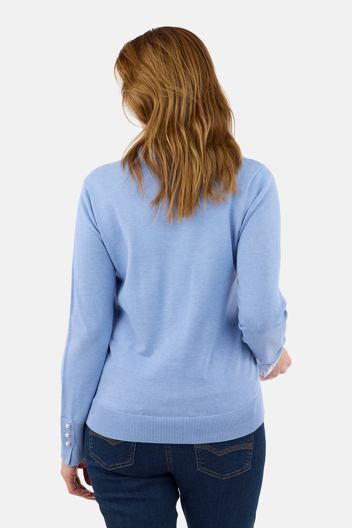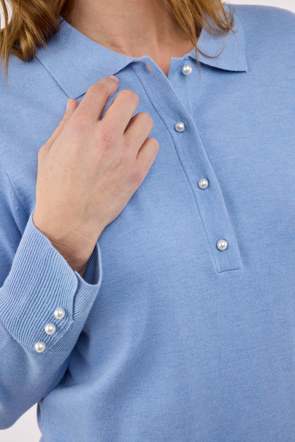 Strik poloen er designet med klassisk krave og en kort knaplukning foran, hvor dekorative perleknapper tilfører et eksklusivt og raffineret præg. De lange ærmer afsluttes med ribkant og små perleknapper ved manchetterne, som understreger det feminine design.