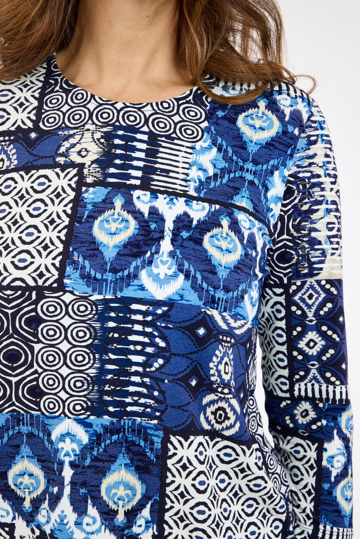 Denne flotte bluse i blå og hvide nuancer har et unikt patchwork-inspireret print, der giver et friskt og moderne udtryk. Modellen er fremstillet i blød viskose med lidt elasthan, som sikrer en behagelig stretch og god komfort. Blusen har rund halsudskæring og 3/4-ærmer, hvilket gør den ideel til både hverdagsbrug og pænere anledninger.